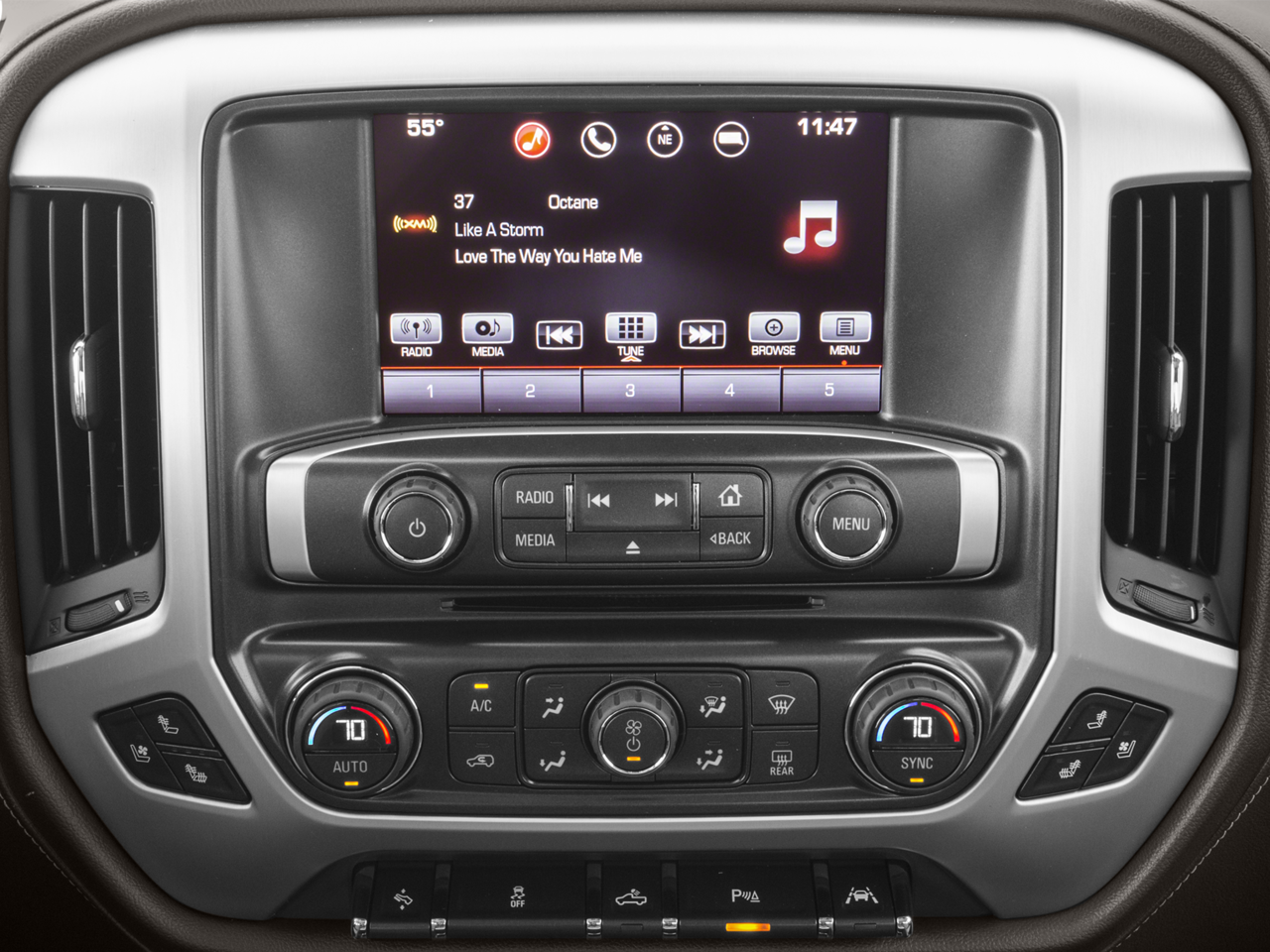 Enhanced Driver Alert Package: Lane Keep Assist; Forward Collision Alert; Low Speed Forward Automatic Braking; Ultrasonic Front and Rear Park Assist; IntelliBeam Automatic High Beam On/off Headlight. SLT Crew Cab Premium Plus Package: Leather Wrapped Heated Steering Wheel; Bose Speaker System; Power Sliding Rear Window with Defogger; Front Full Feature Power Reclining Bucket Seats; Spray-On Pickup Box Bed Liner with GMC Logo; High-Performance LED Headlamps; Integrated Trailer Brake Controller; AM/FM Stereo with 8" Diagonal Color Touch Navigation; Heated and Ventilated Front Bucket Seats; 6" Rectangular Chromed Tubular Assist Steps. Preferred Equipment Group 4SA: LED Cargo Box Lighting; EZ Lift and Lower Tailgate; Chrome Door Handles; Rear Vision Camera; Rear 60/40 Folding Bench Seat (folds Up); Remote Vehicle Starter System; Electric Rear Window Defogger; Theft Deterrent System (unauthorized Entry); Auxiliary External Transmission Oil Cooler; 4.2" Diagonal Color Display Driver Info Center; Trailering Equipment; 110-Volt AC Power Outlet; Thin Profile LED Fog Lamps; 150 Amp Alternator; Steering Wheel Audio Controls; Universal Home Remote; Color-Keyed Carpeting; Power Windows with Driver Express Up and Down; OnStar 3 Month Guidan